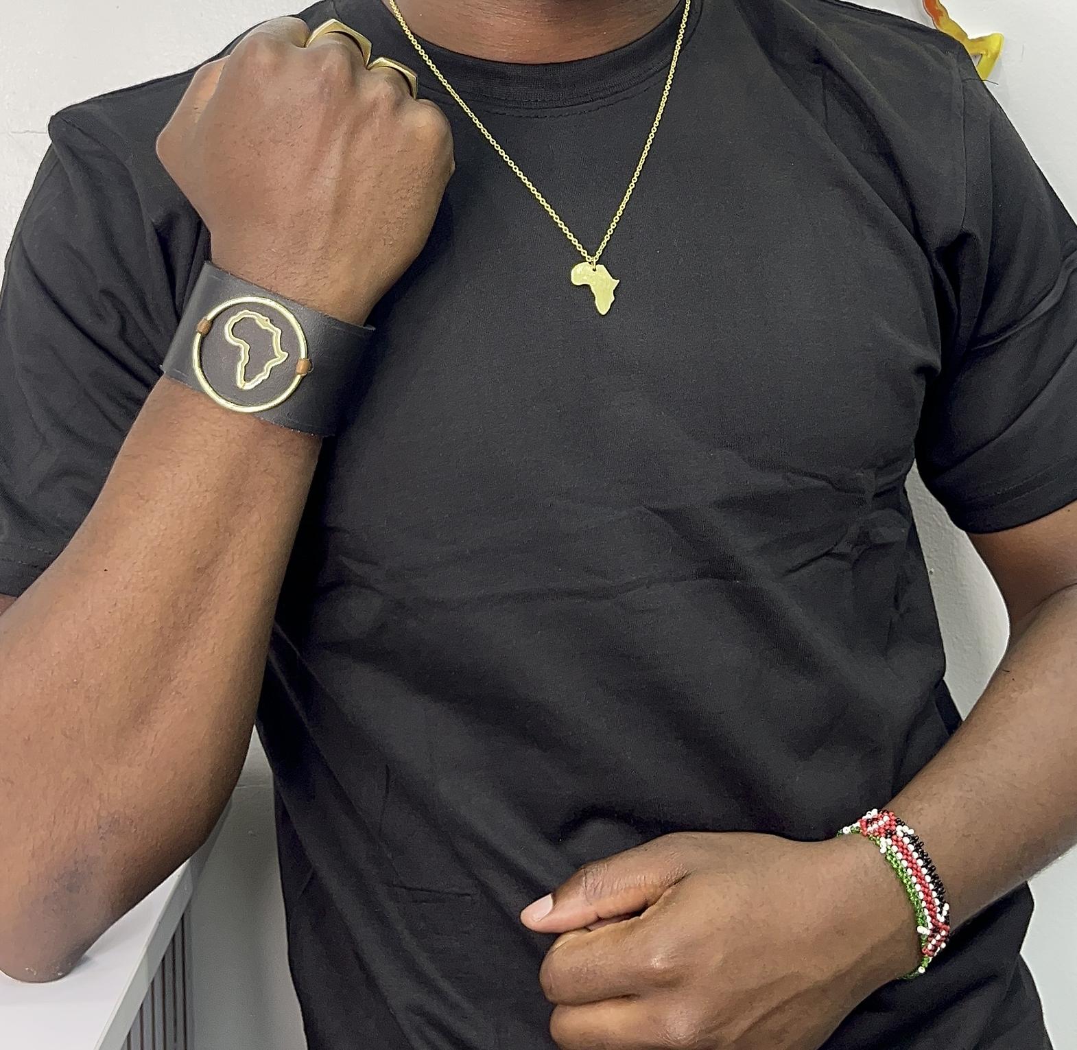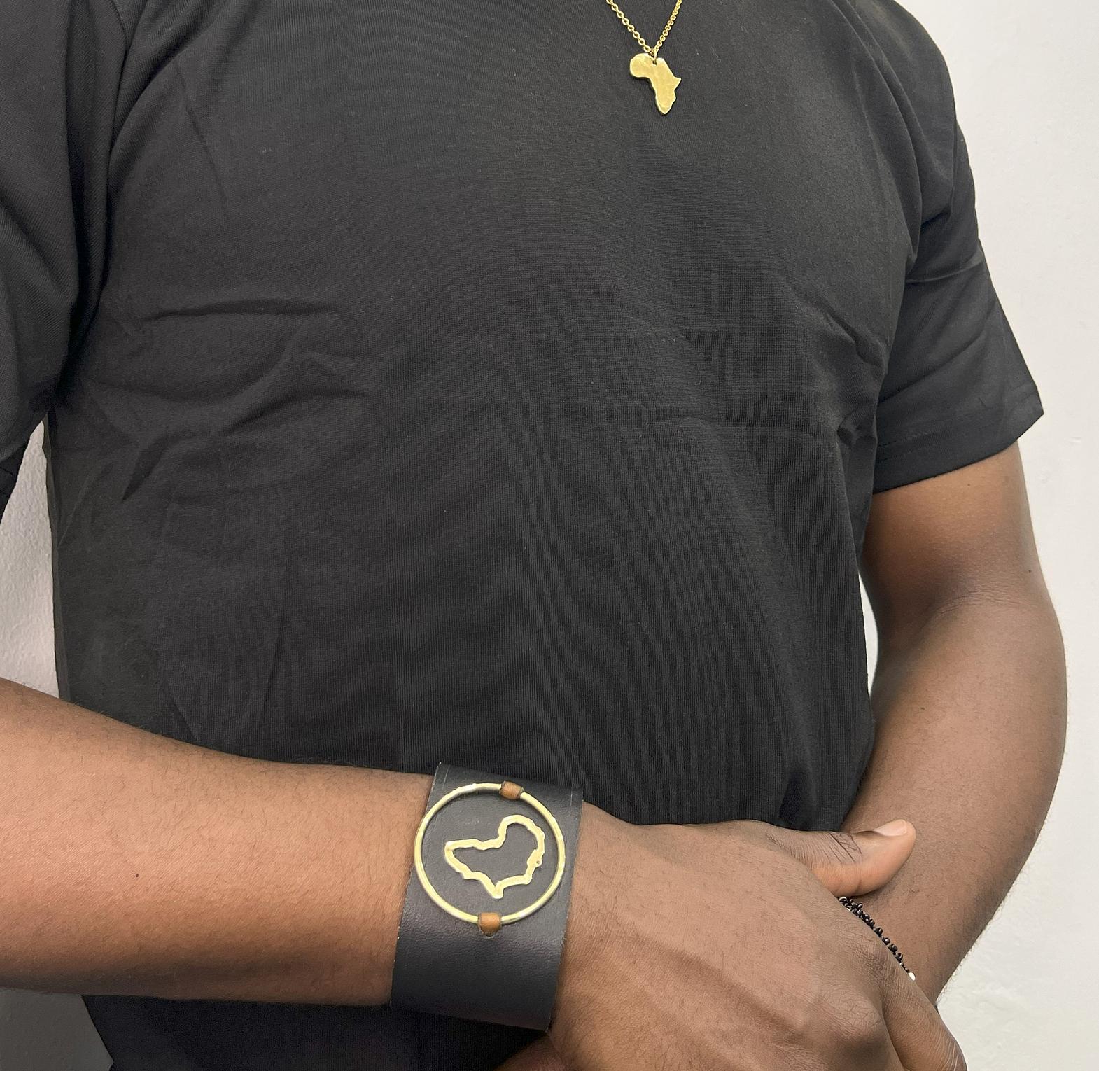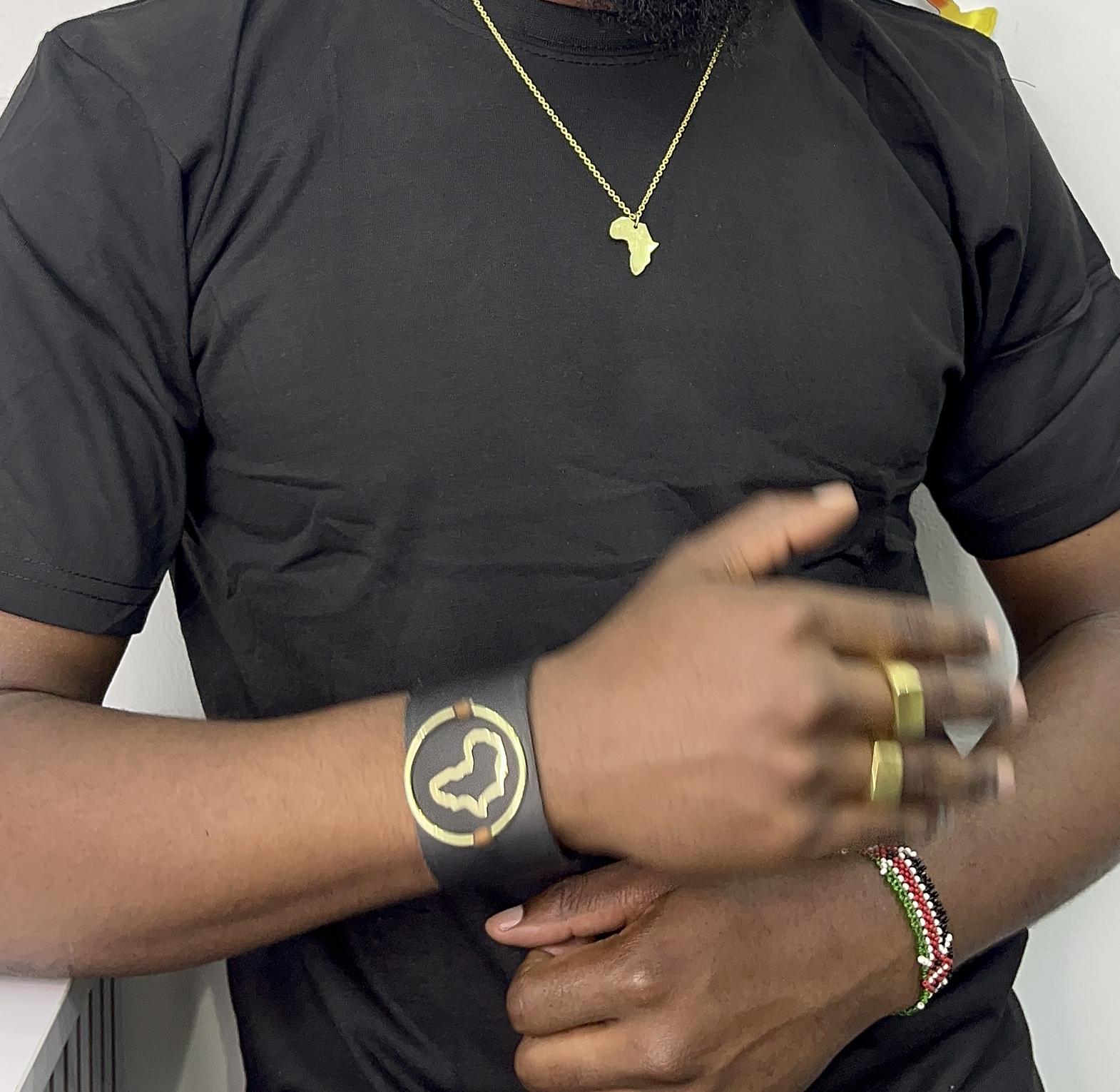 The Tau Bracelet is crafted from premium leather with bold brass accents, combining durability with style.