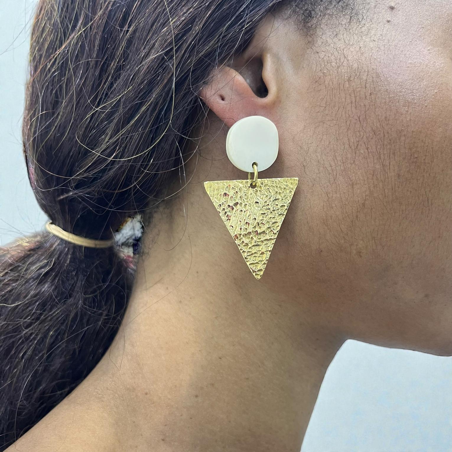 The earrings feature a minimalist geometric design consisting of a circular stud or disc at the top from which a large textured triangle is suspended.