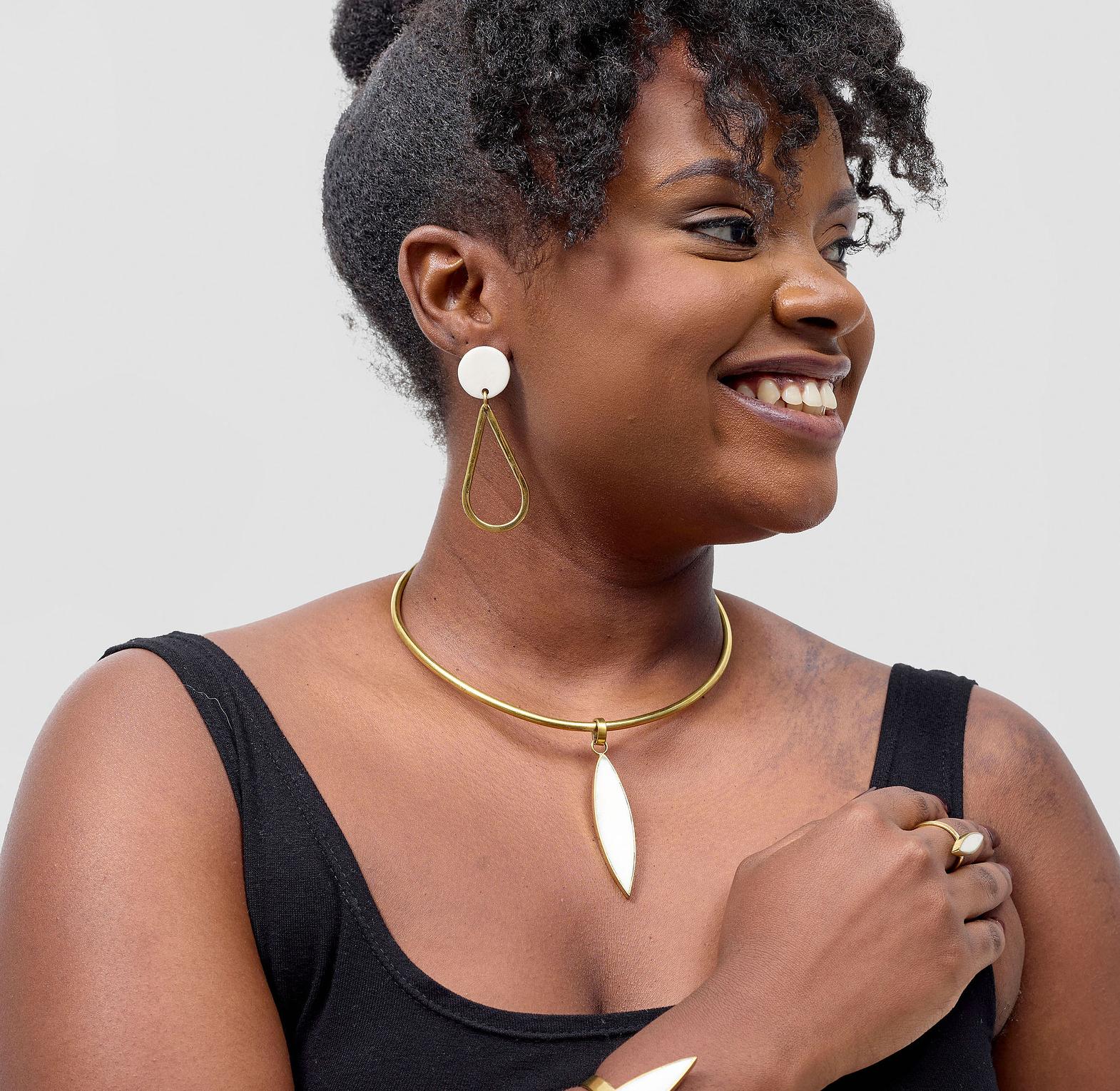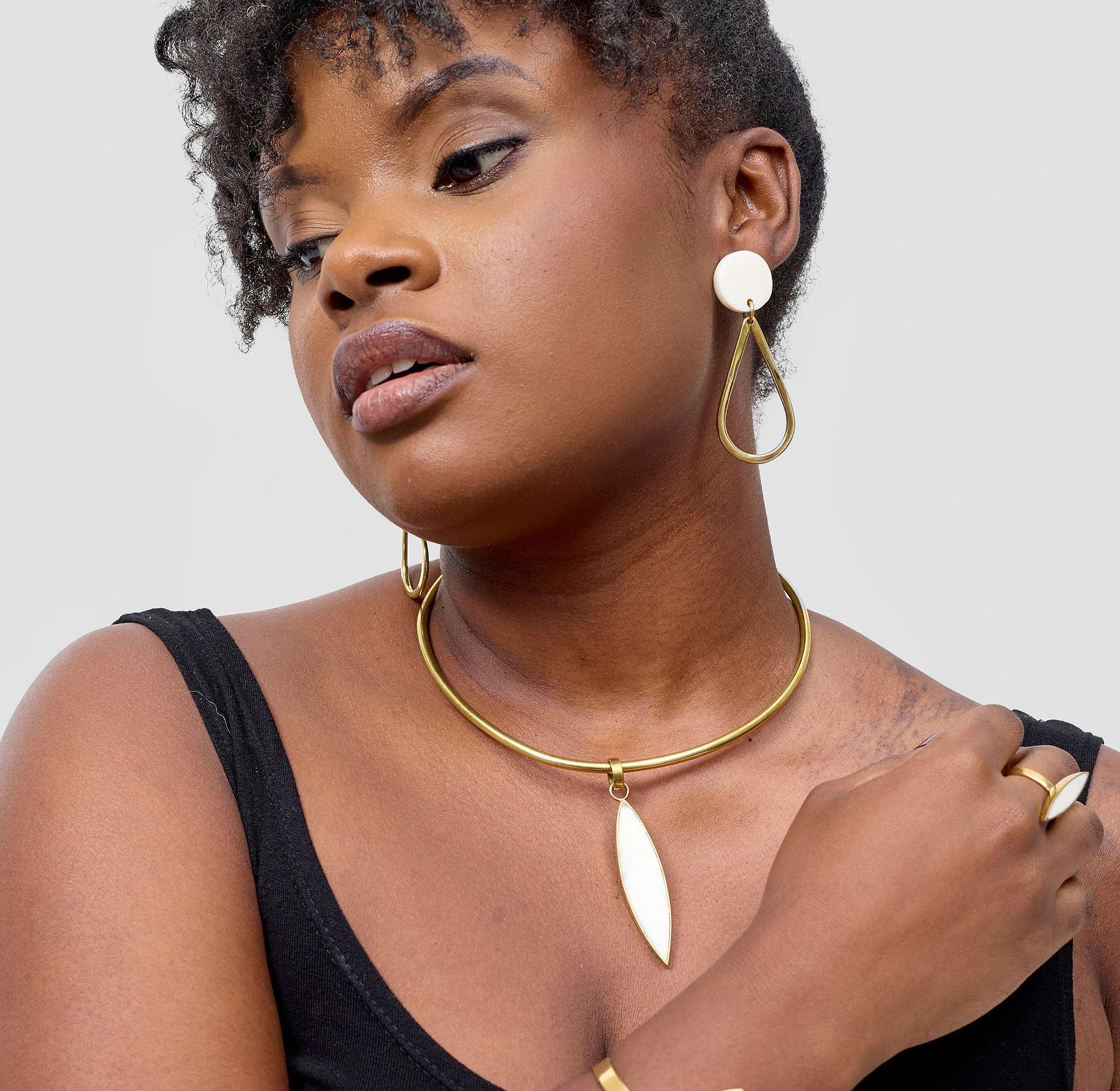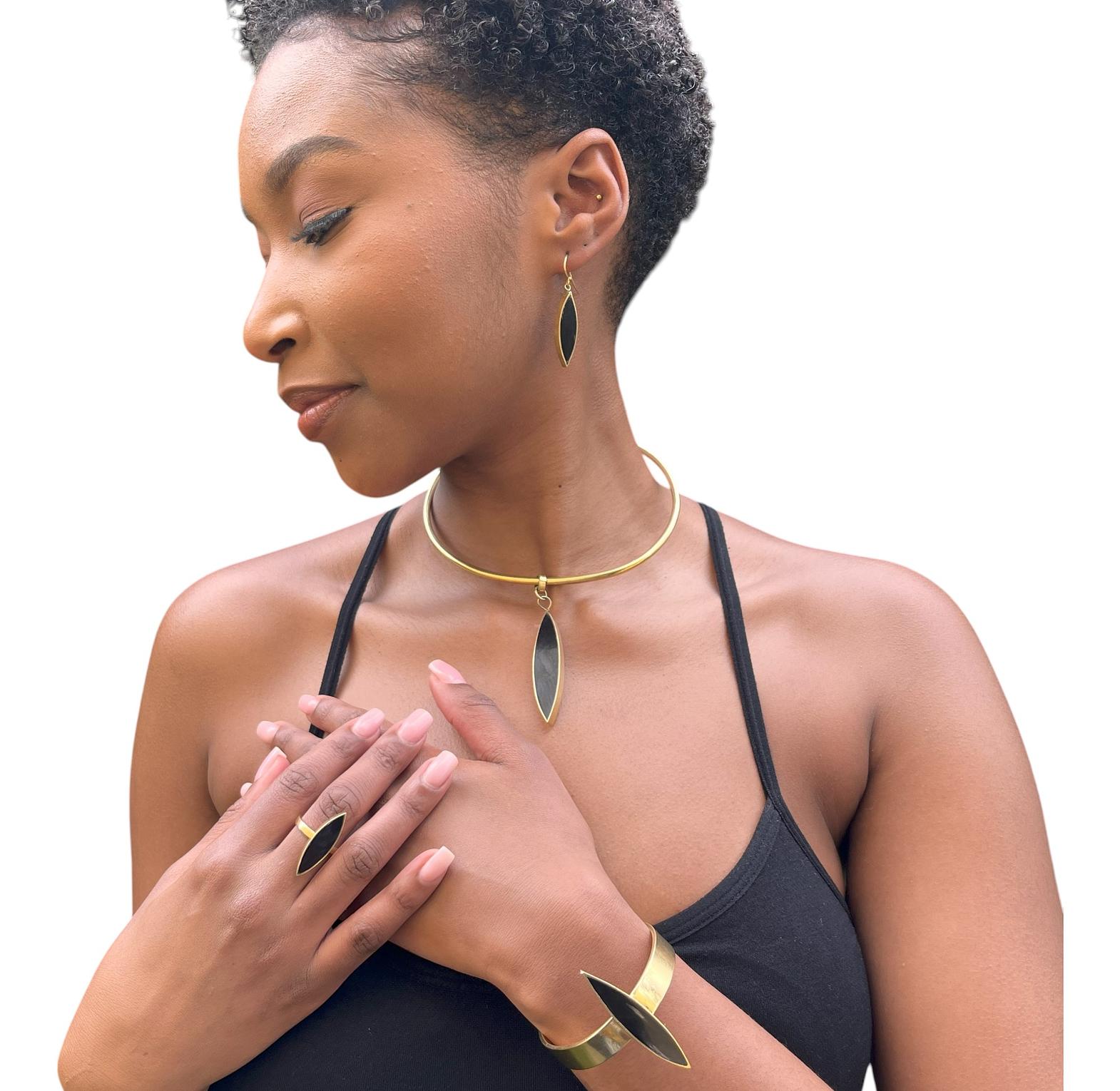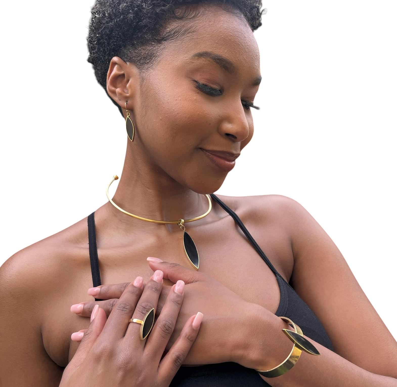 Featuring a matching choker, earrings, bracelet, and ring, this set is designed for the woman who loves to stand out with grace.