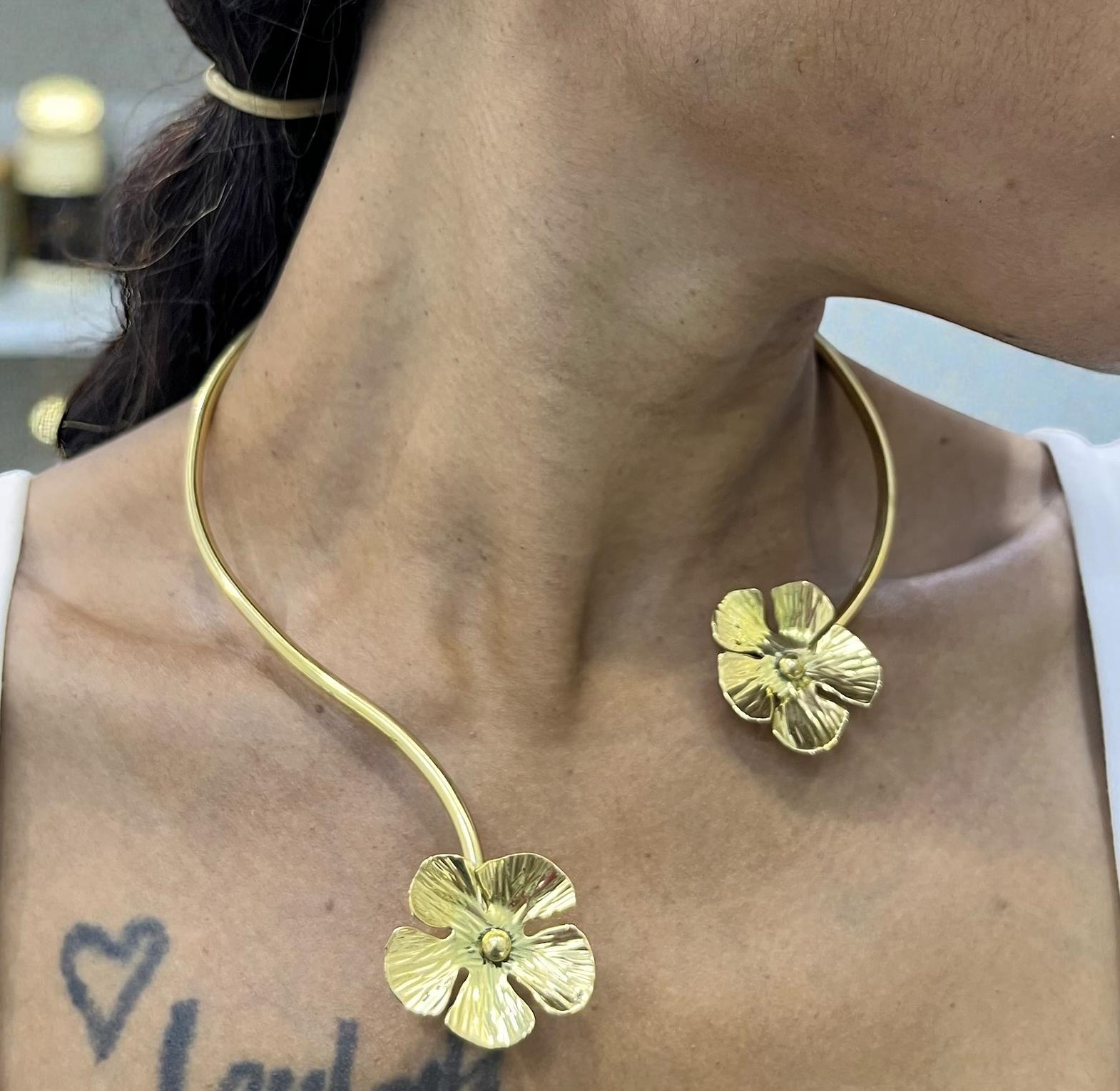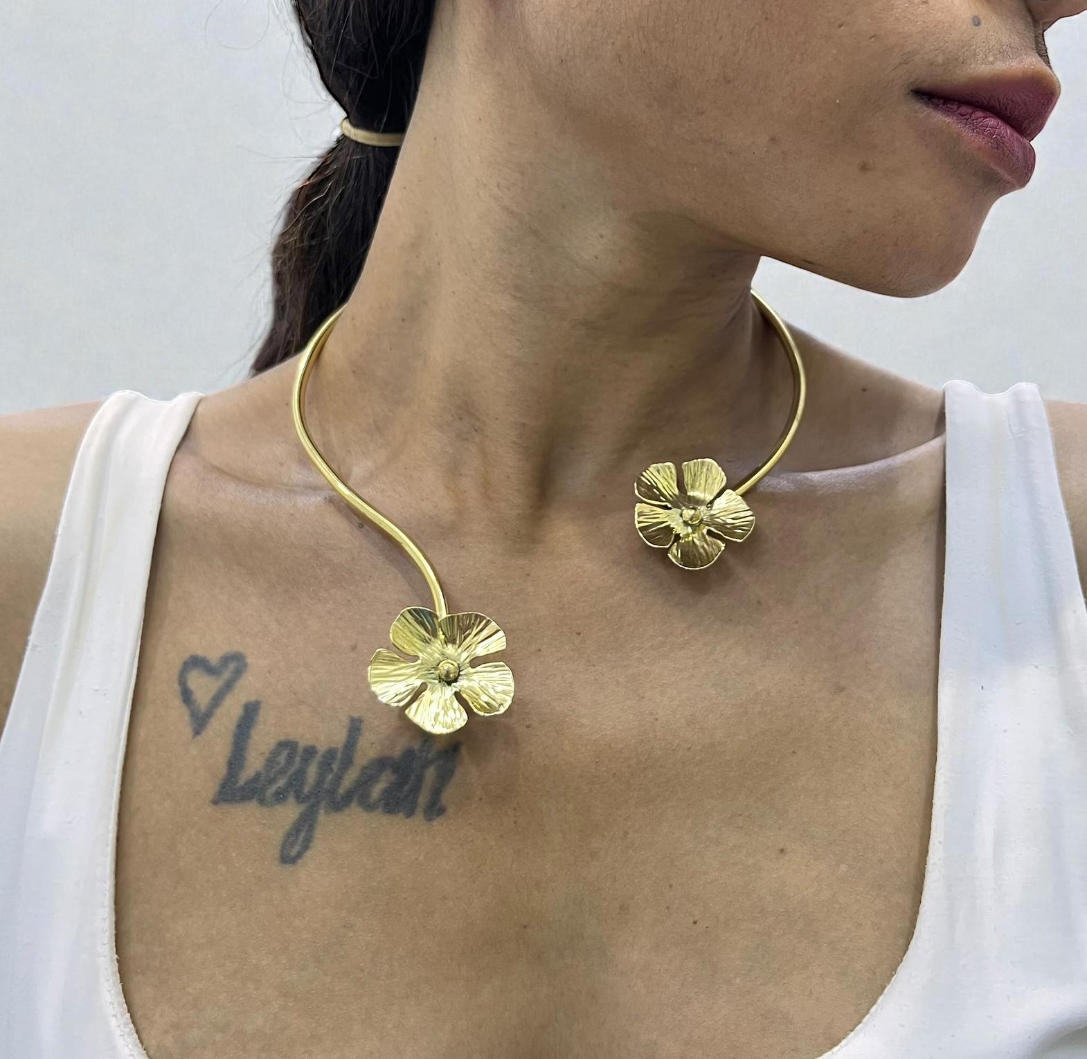 The specific style,characterized by its open-ended wire collar design with sculptural flower pendants at each end,is a popular statement accessory for both casual and formal occasions.