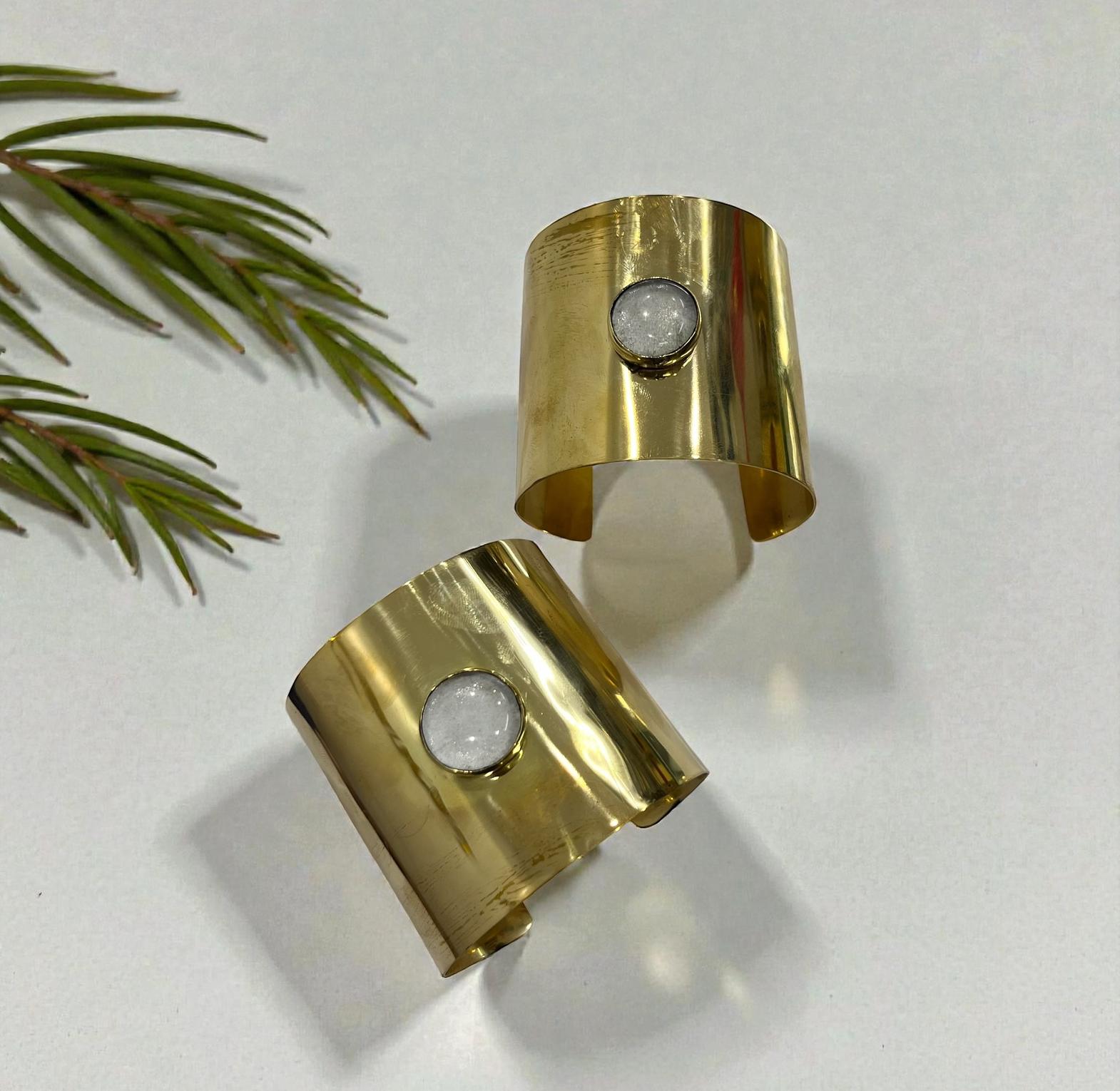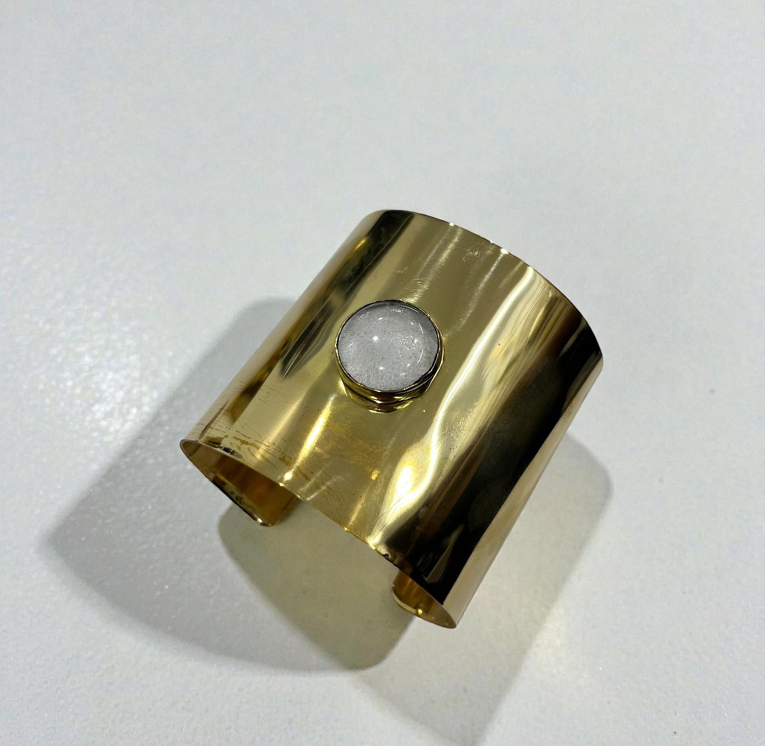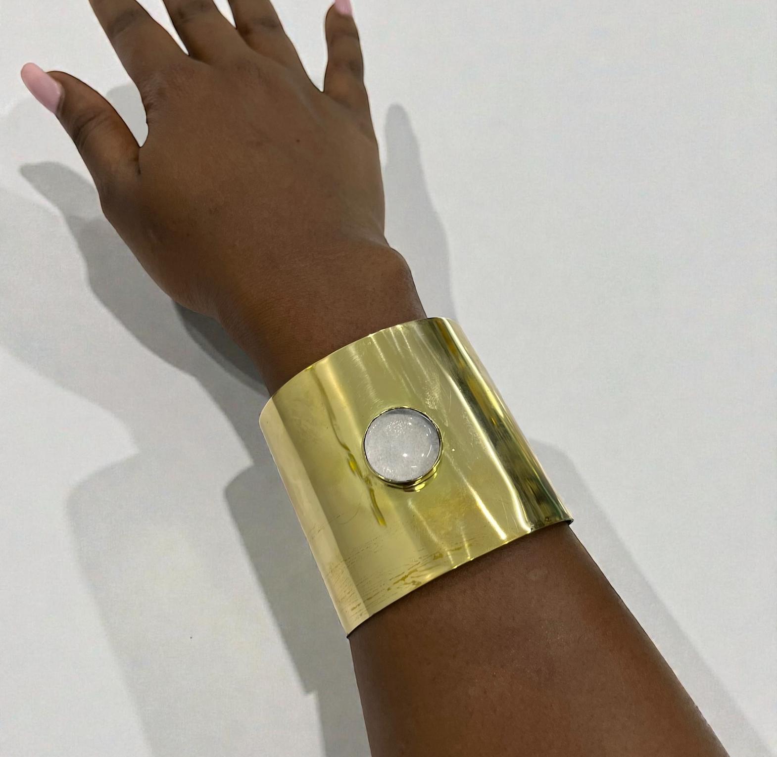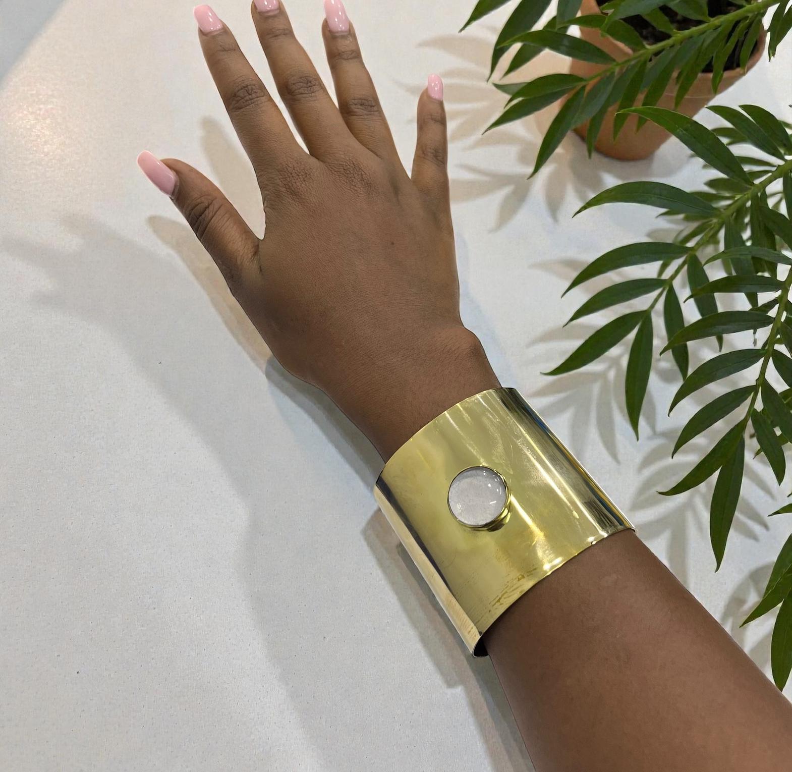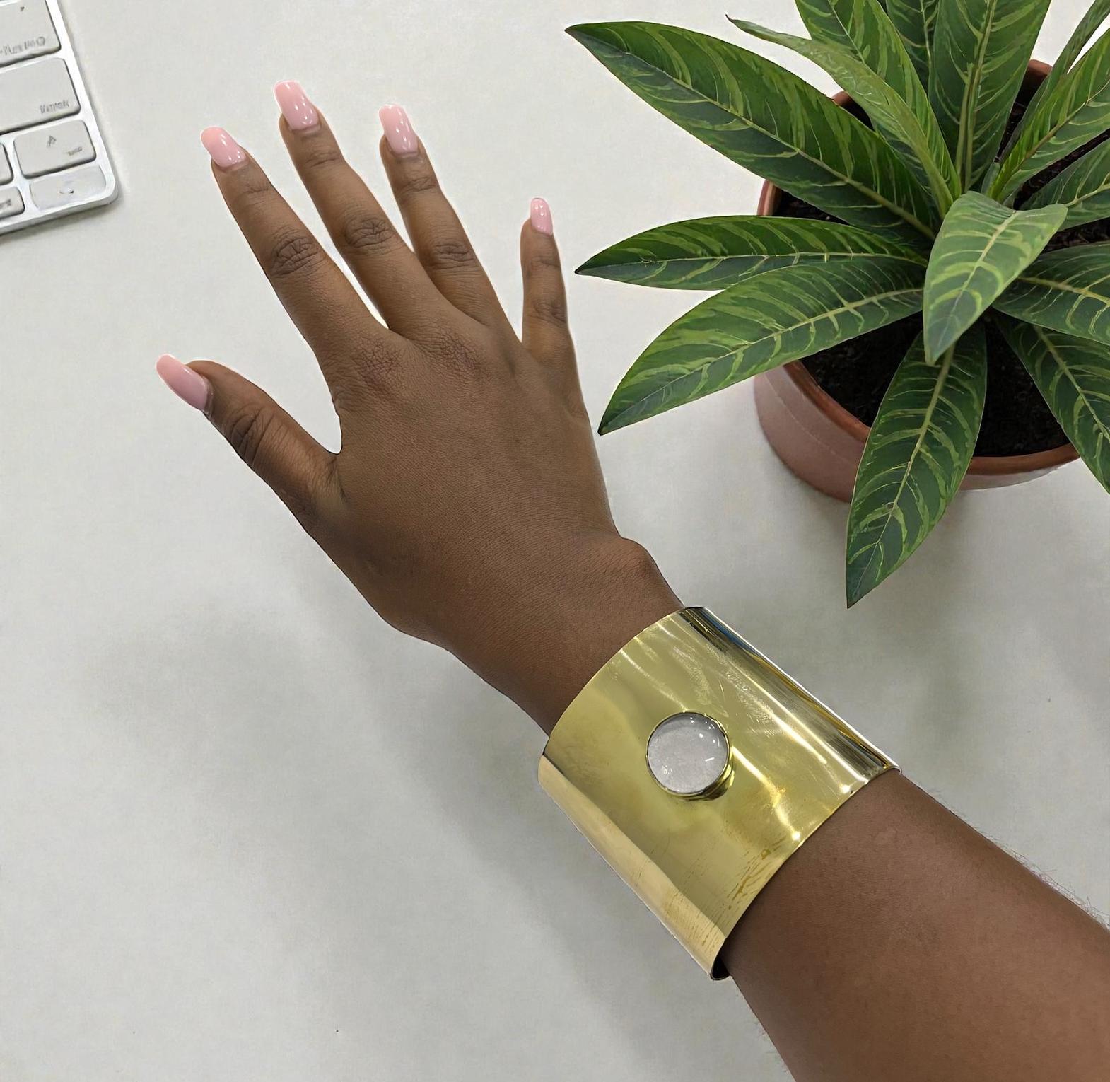 This Wide cuff bracelet is a statement look for differents occasion with a resin or similar material for the white circle.
