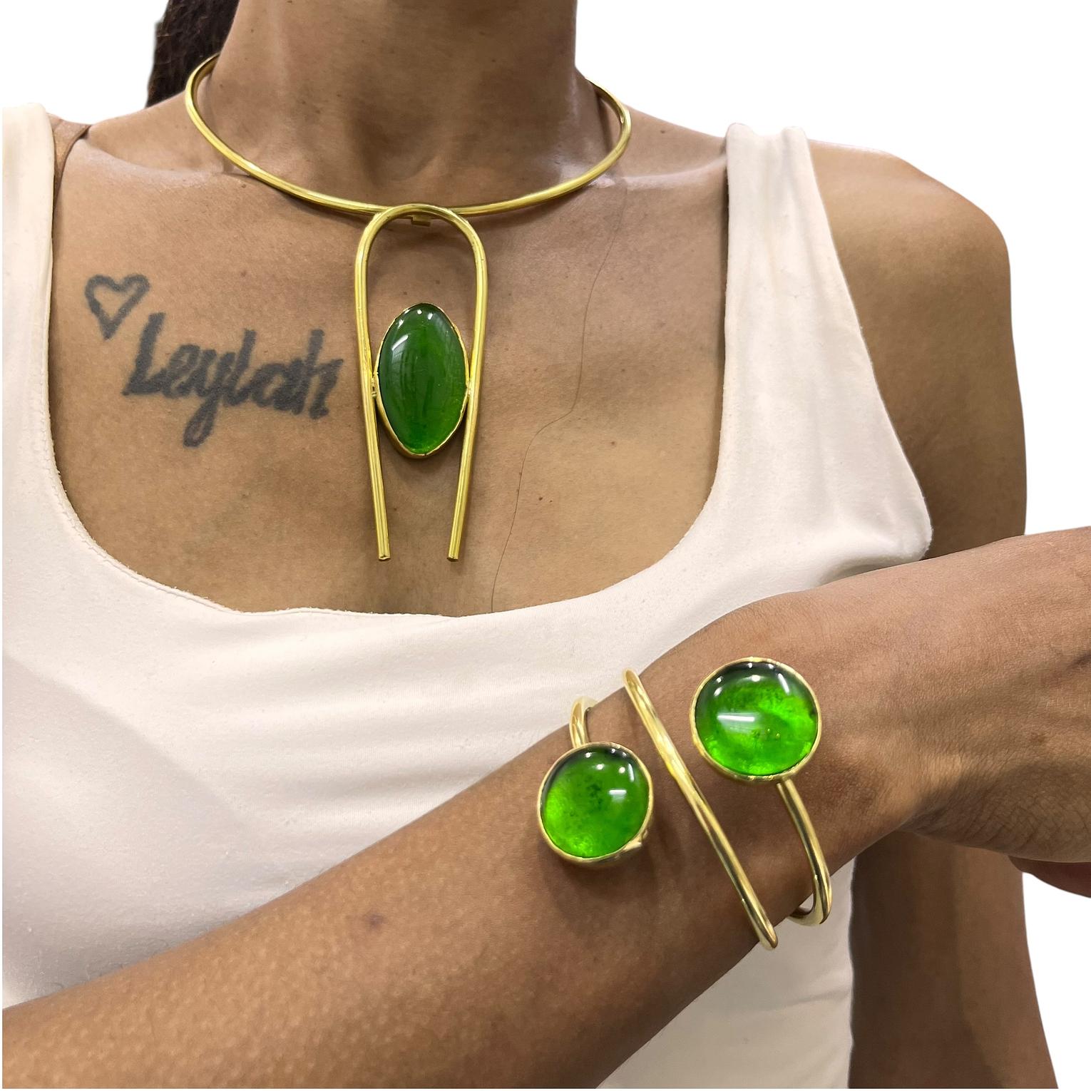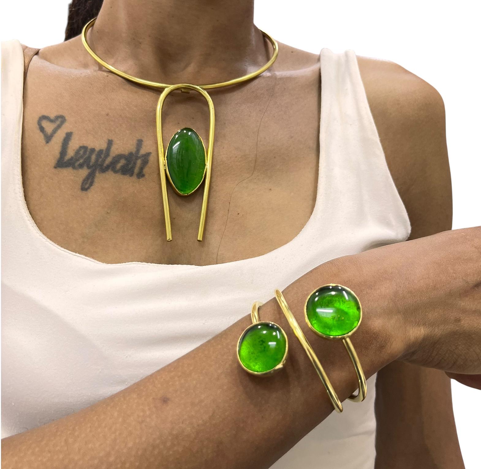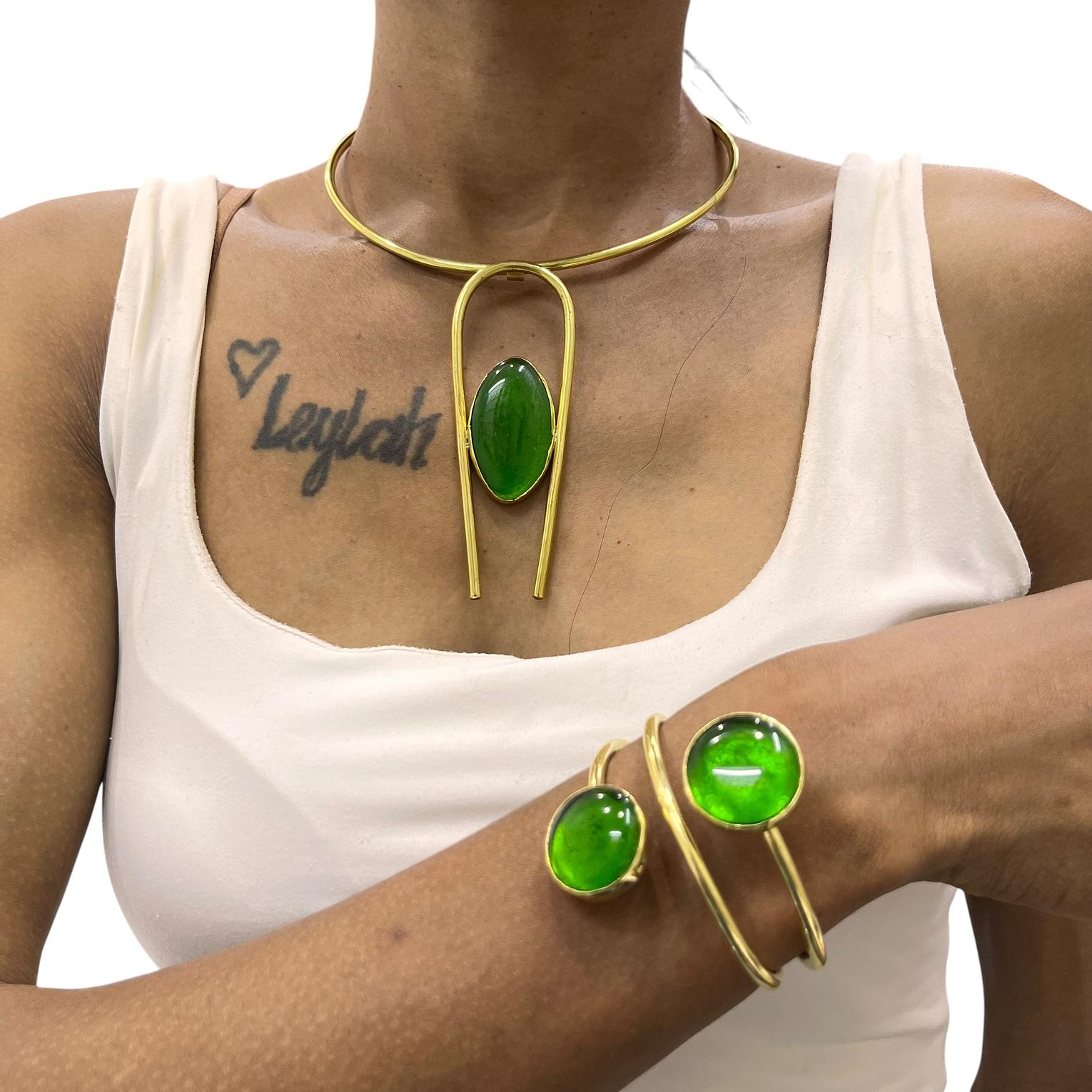 This jewelry set is a handcrafted ensemble made from recycled brass and green gemstones,widely recognized as a ''wiki''or''maisha''style pieces are typically artisanal creations from Kenya often associated with brands like PURELY BRASS AFRICA.
