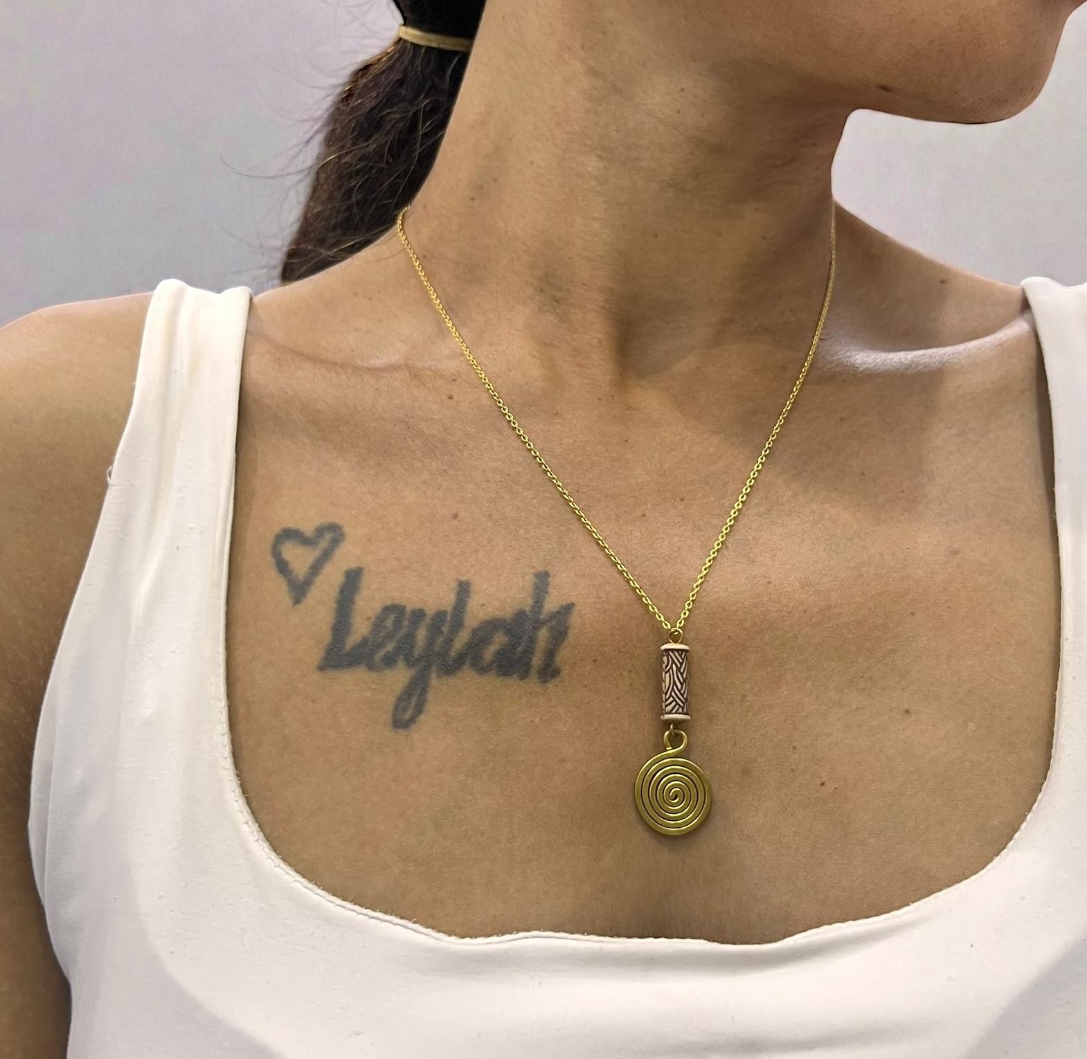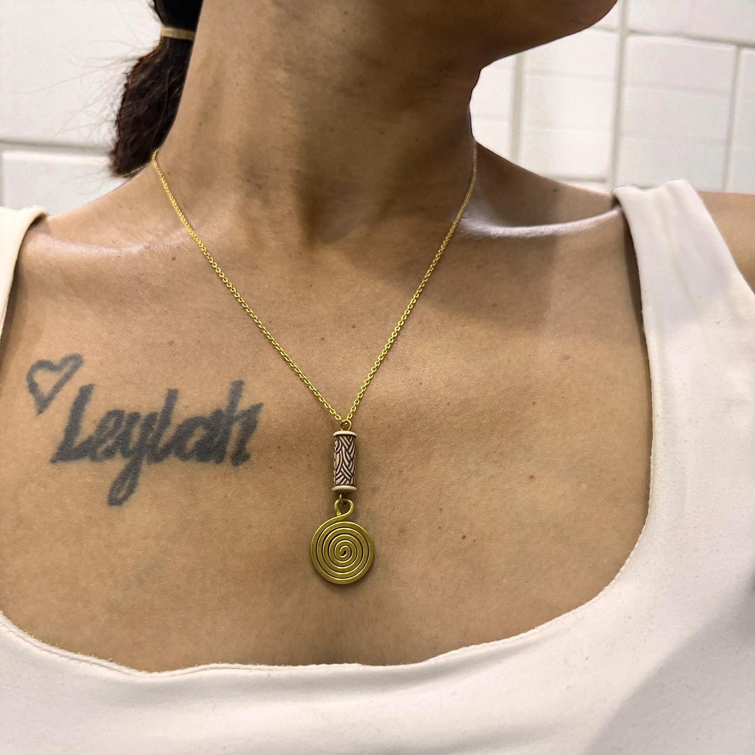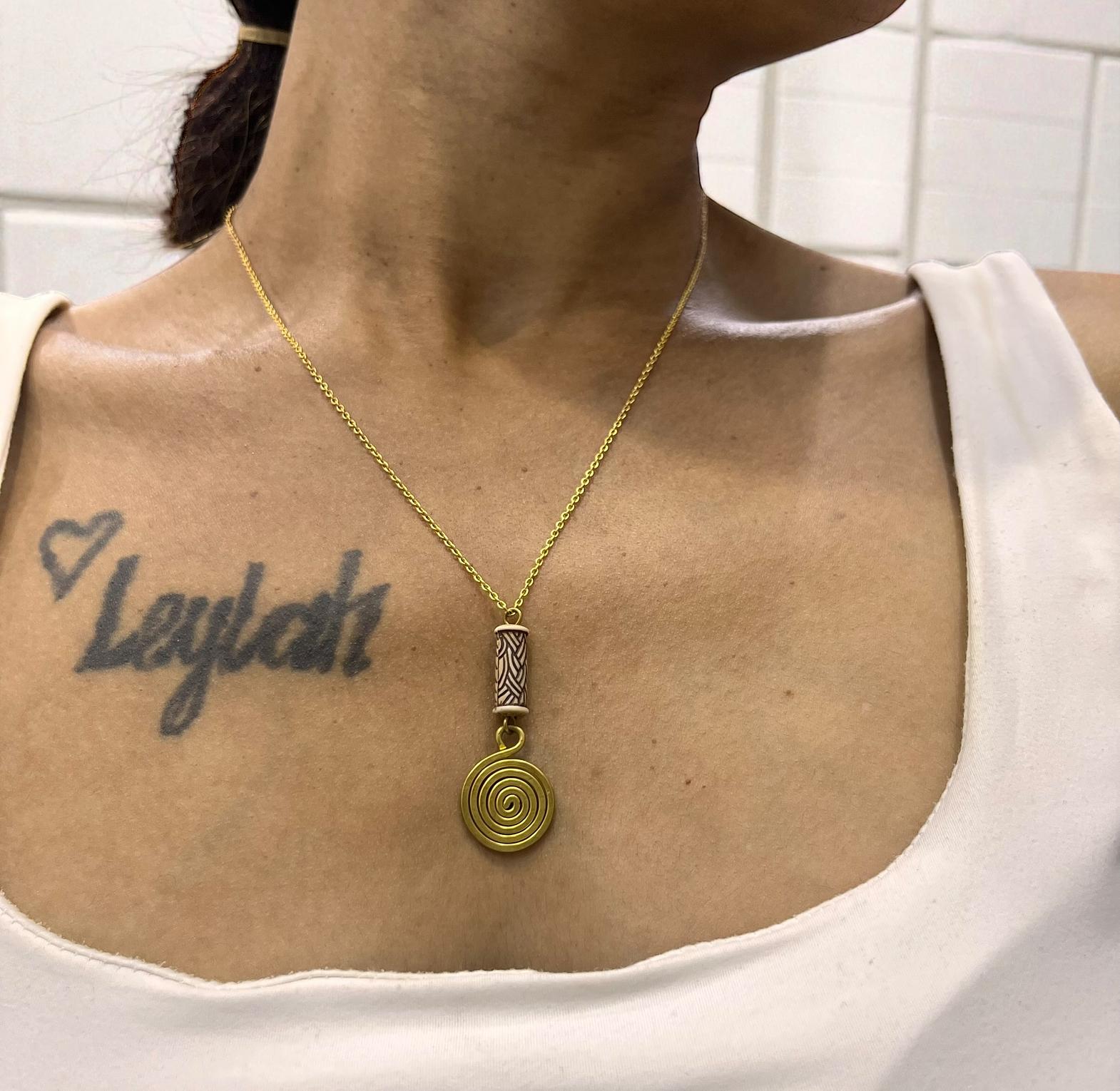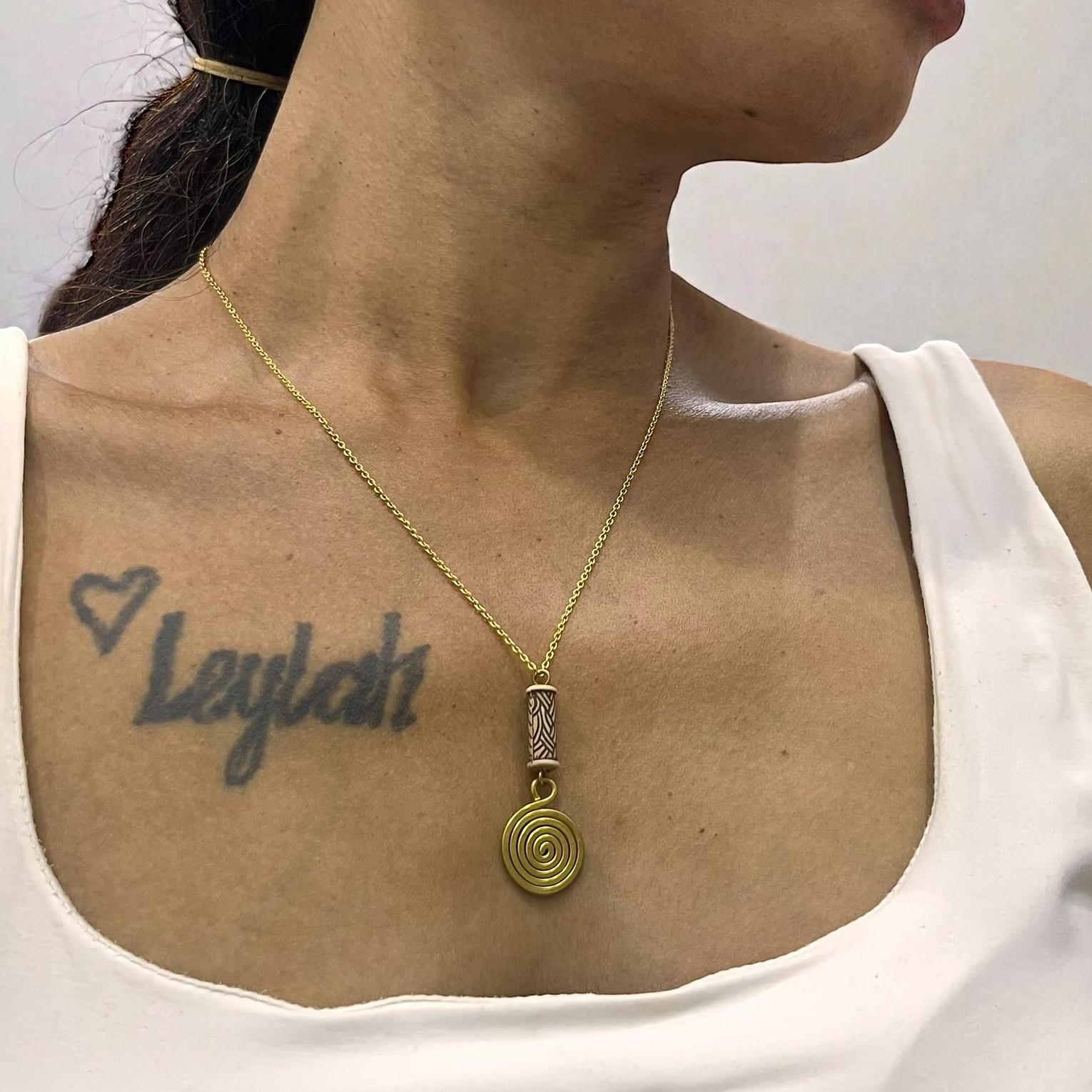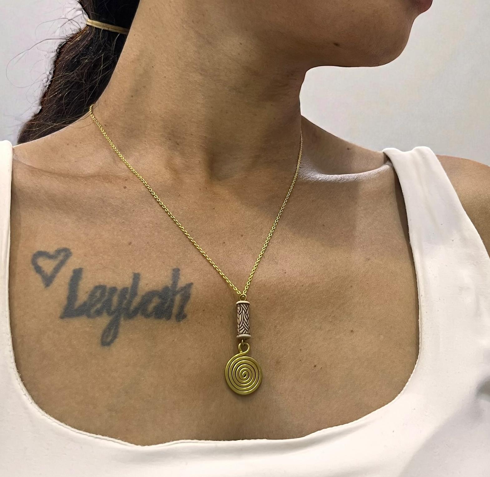 This necklace features a handcrafted brass pendant with a spiral design typical of artisan jewelry made in Kenya .